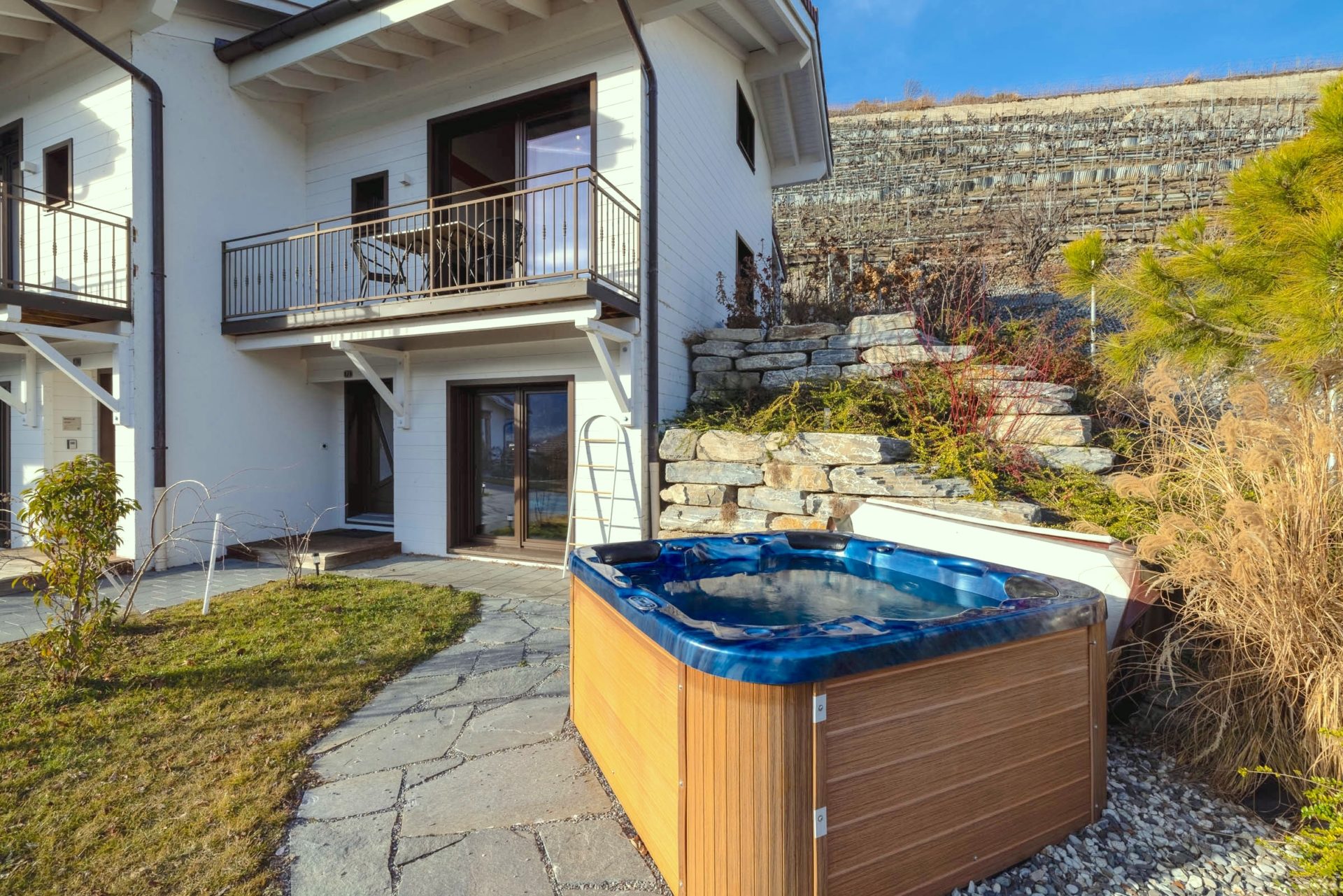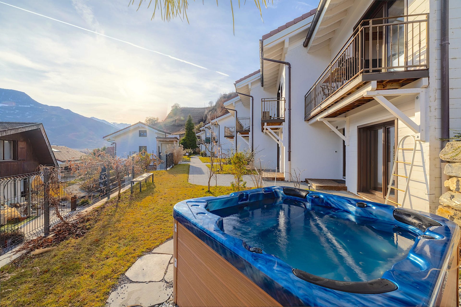 Sur ma pelouse exposée plein sud, vous apprécierez les moments de détente dans le jacuzzi, tout en profitant de la vue sur les Alpes.